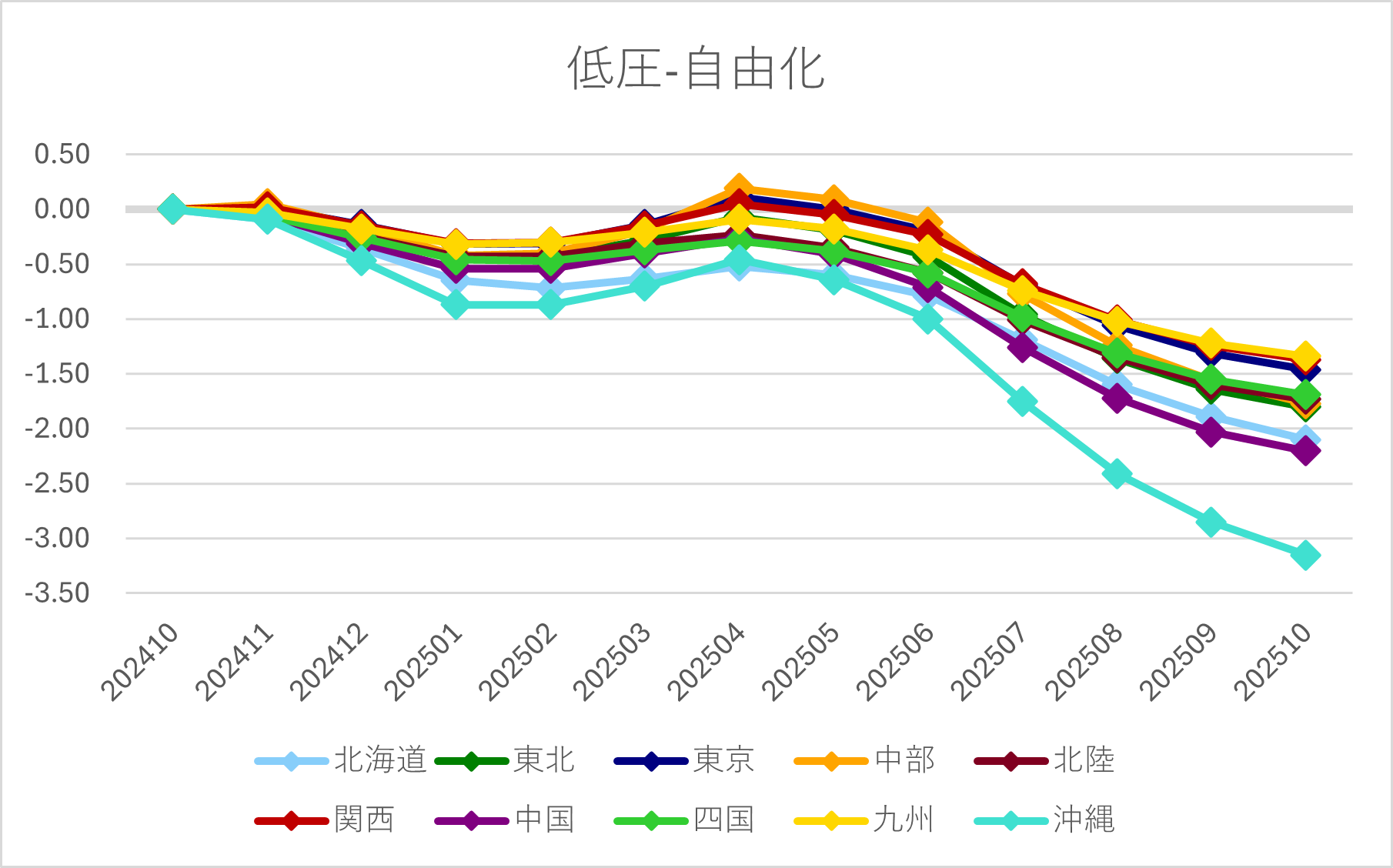 ・全体として価格は横ばい~減少傾向。沖縄の下落が目立つ。関西-規制燃調は上限に張り付いているため値動きに乏しい。