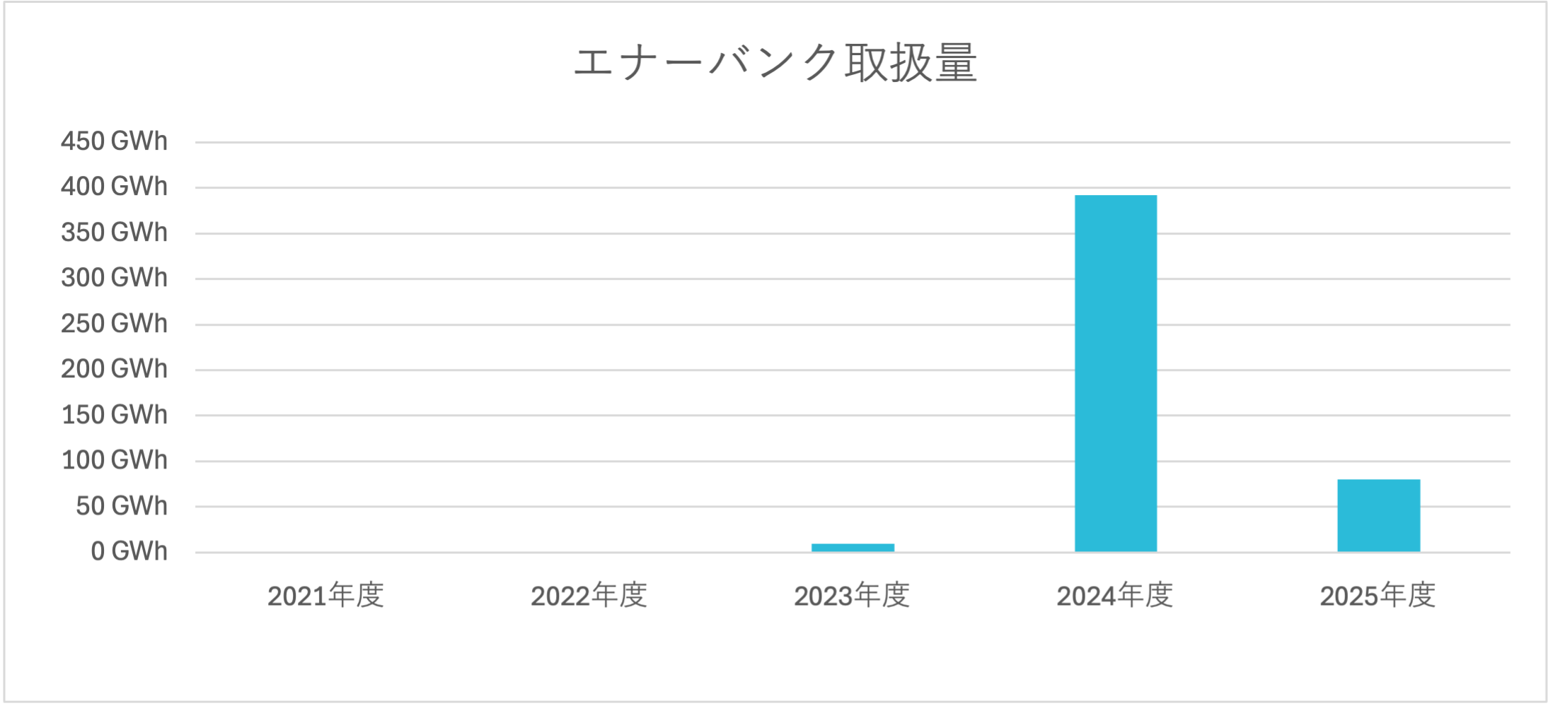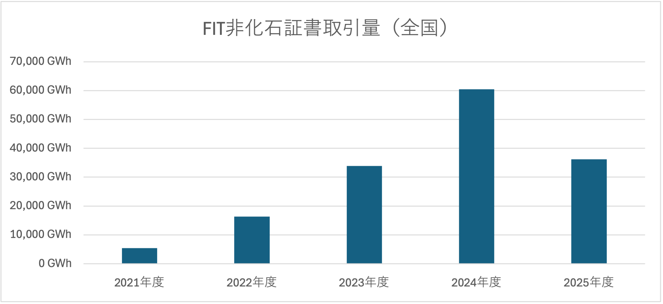 FIT非化石証書は2021年度より販売されています。当初は小売電気事業者のみが購入可能でしたが、2023年度より需要家が直接調達できるようになりました。脱炭素へのトレンドとも相まって、日本全体での取引量は増加を続けており、24年度は6万GWhを超える供給量となりました。