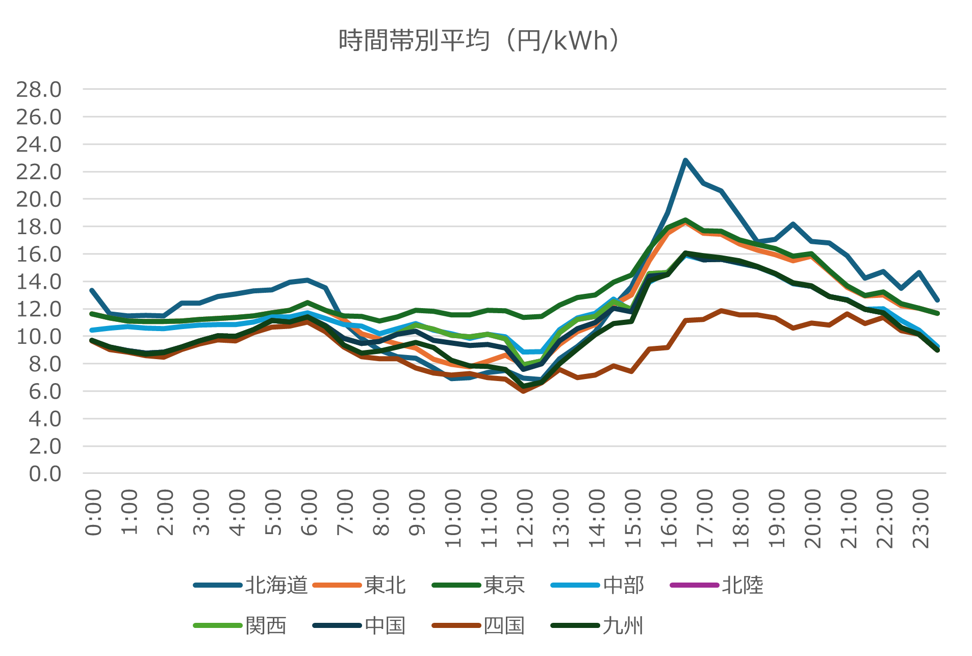 時間帯別の価格推移をみると、どのエリアでも16:00~20:00の時間帯の価格が高い傾向となっており、中でも北海道の16:30では22.8円/kWhとなっています。