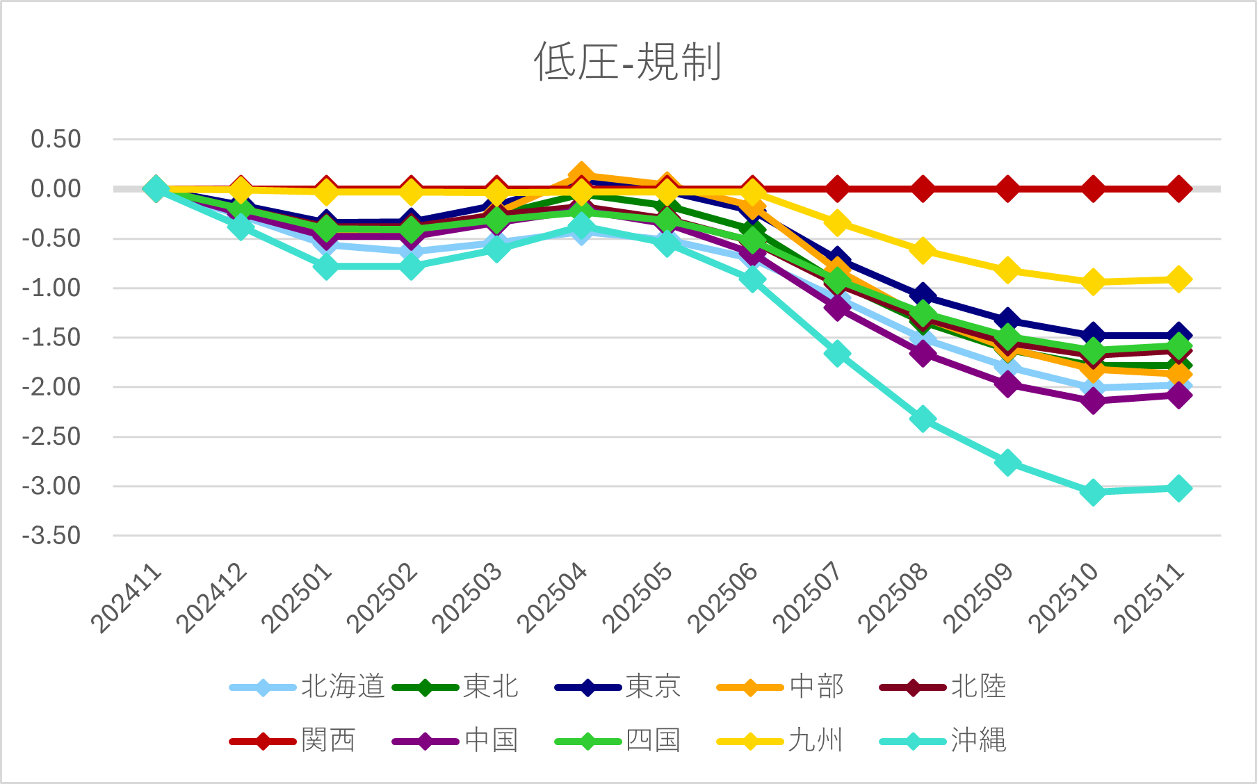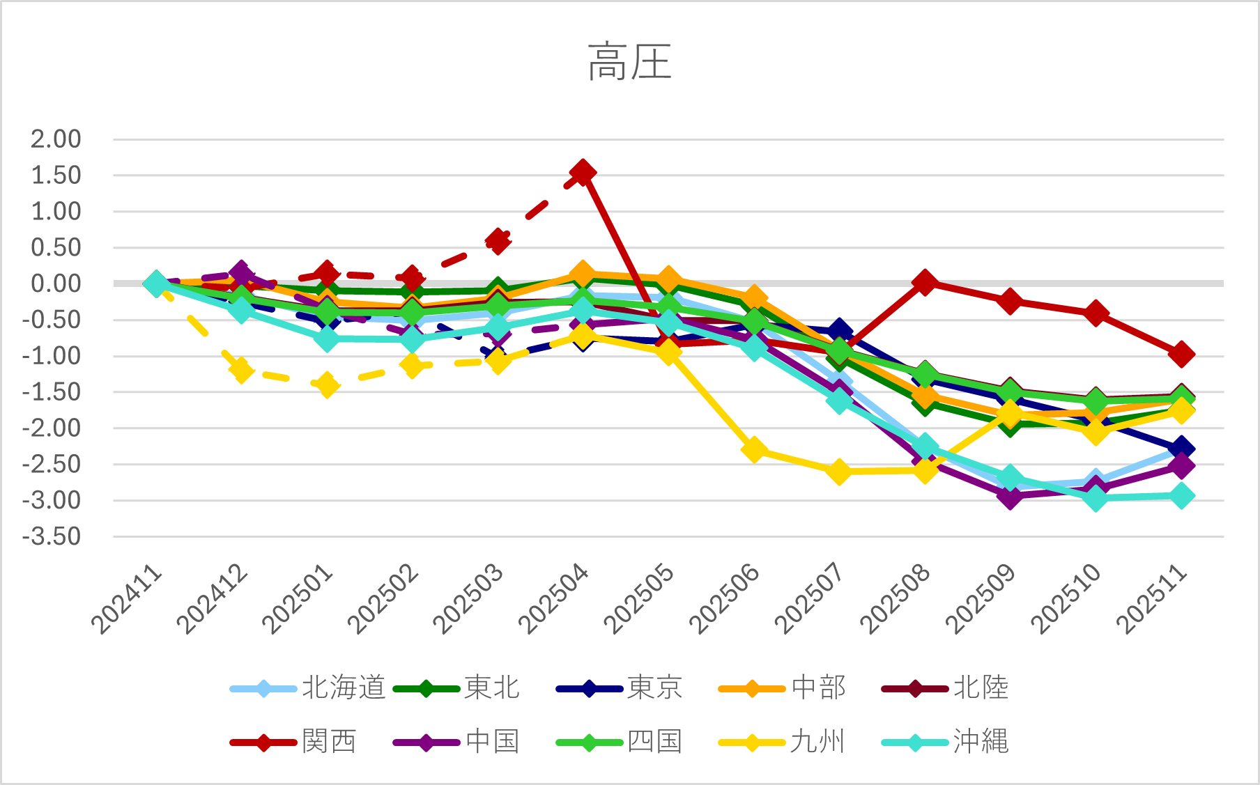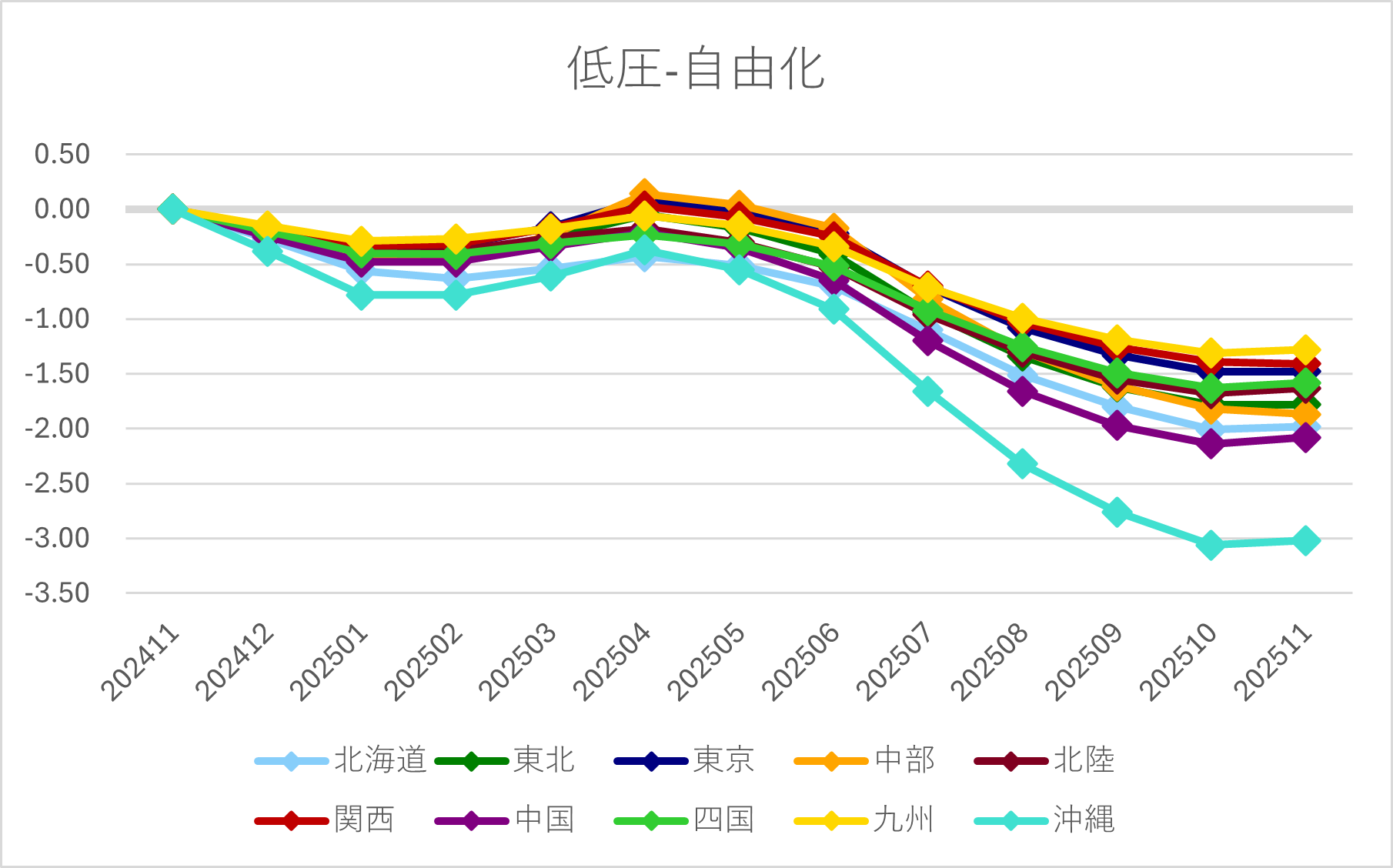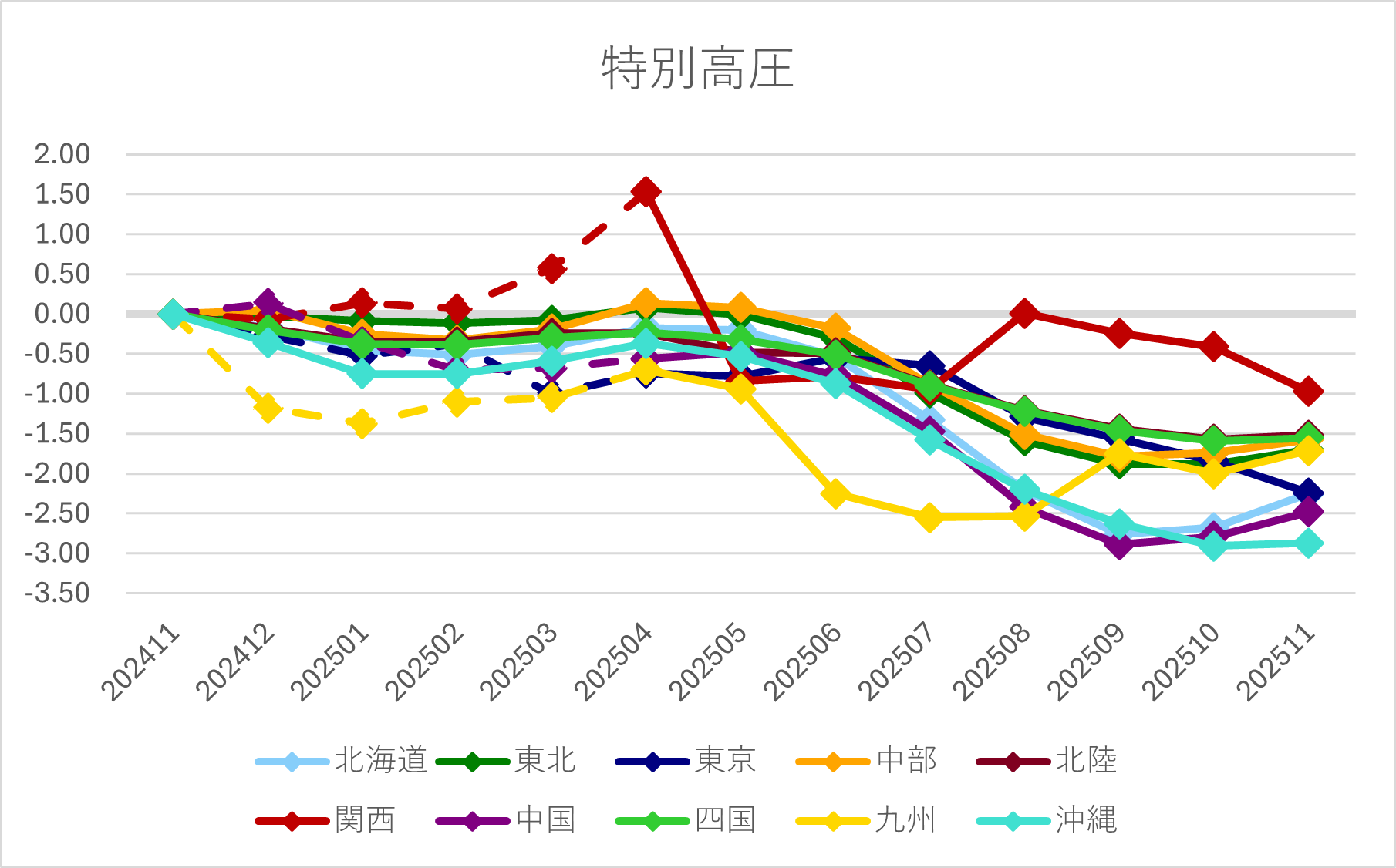 ・全体として価格は横ばい傾向。沖縄の下落が目立つ。関西-規制燃調は上限に張り付いているため値動きに乏しい。