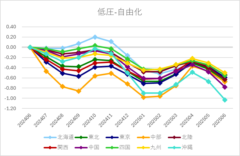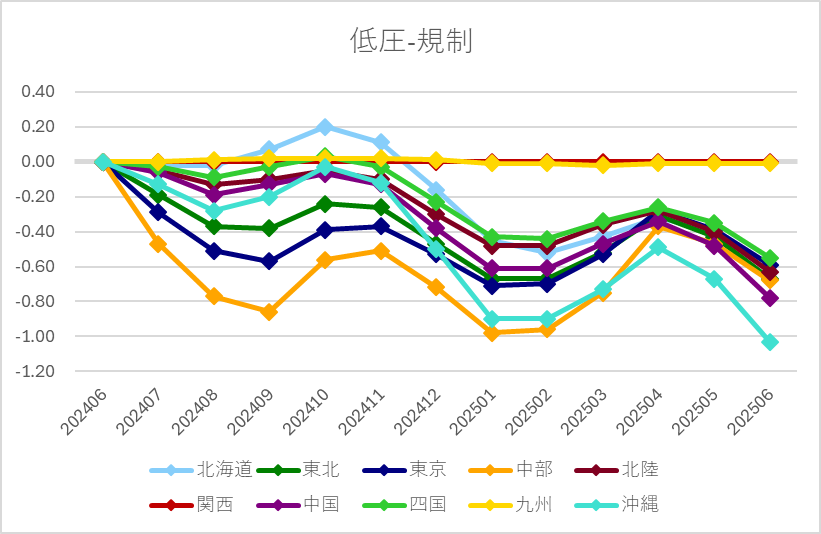 →すべてのエリアで市場価格調整項が含まれず、燃料費調整項の参照期間も同一であるため。 - ただし関西・九州では規制燃調が上限に張り付いているため、動きが乏しい