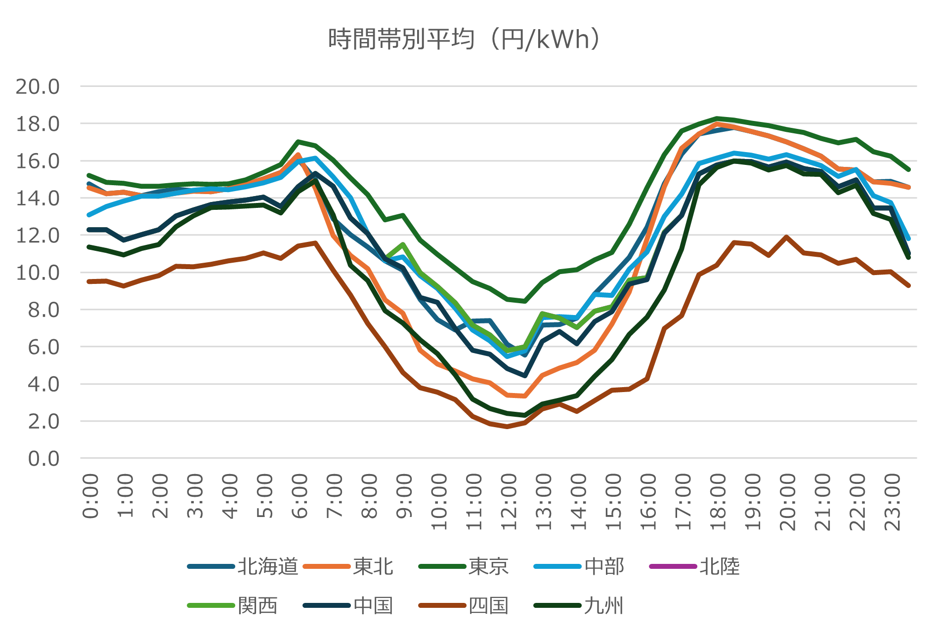 エリアプライス平均価格の夜間(22-8)において全エリアで平均2.63円/kWh上昇しており、特に東京は3.97円/kWhの上昇となっています。